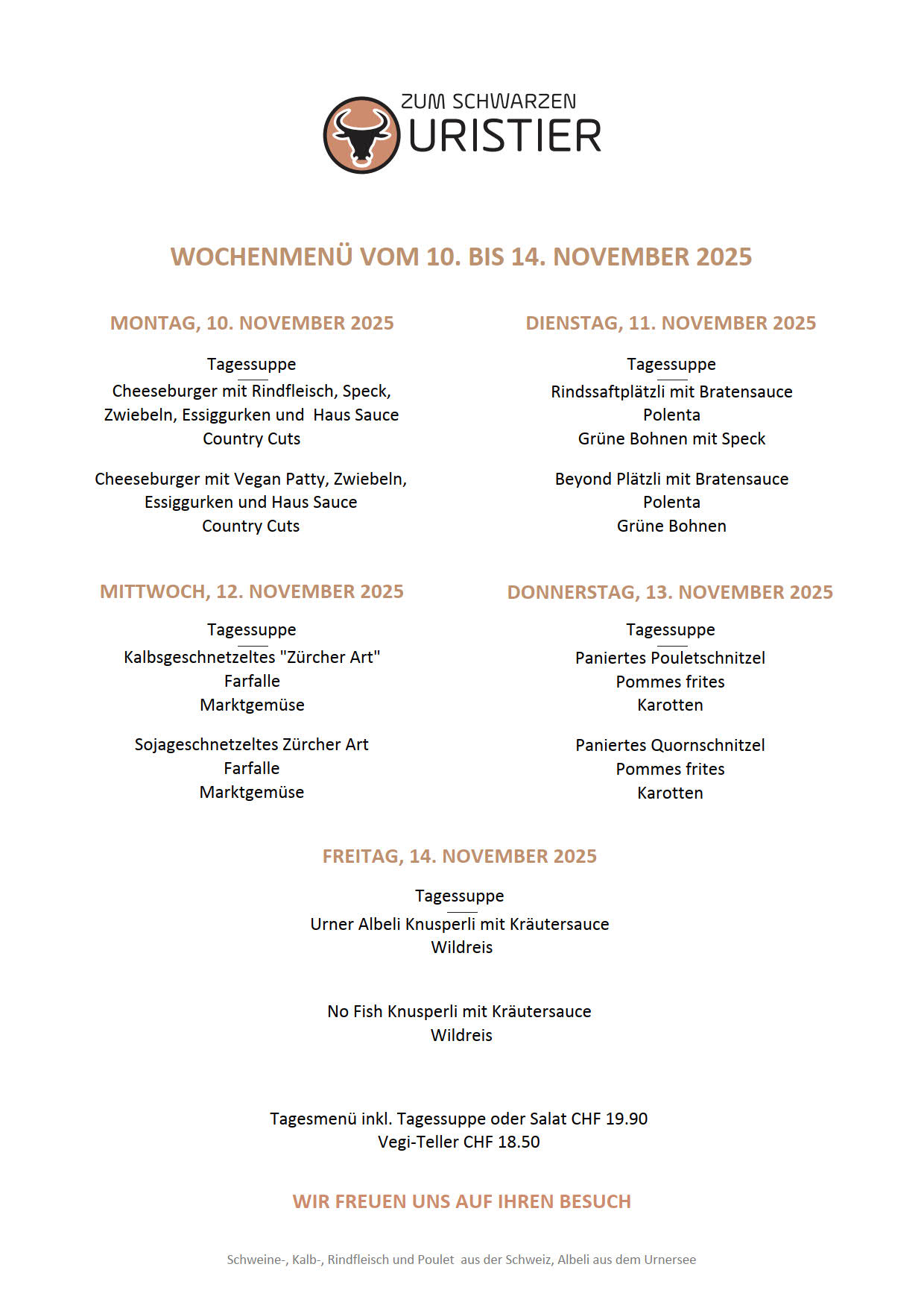 Im Tagesrestaurant «Zum schwarzen Uristier» verwöhnen wir Sie von Montag bis Freitag von 11 bis 15 Uhr. Entdecken Sie unsere frisch zubereiteten, saisonalen Angebote und unseren freundlichen, effizienten Service.