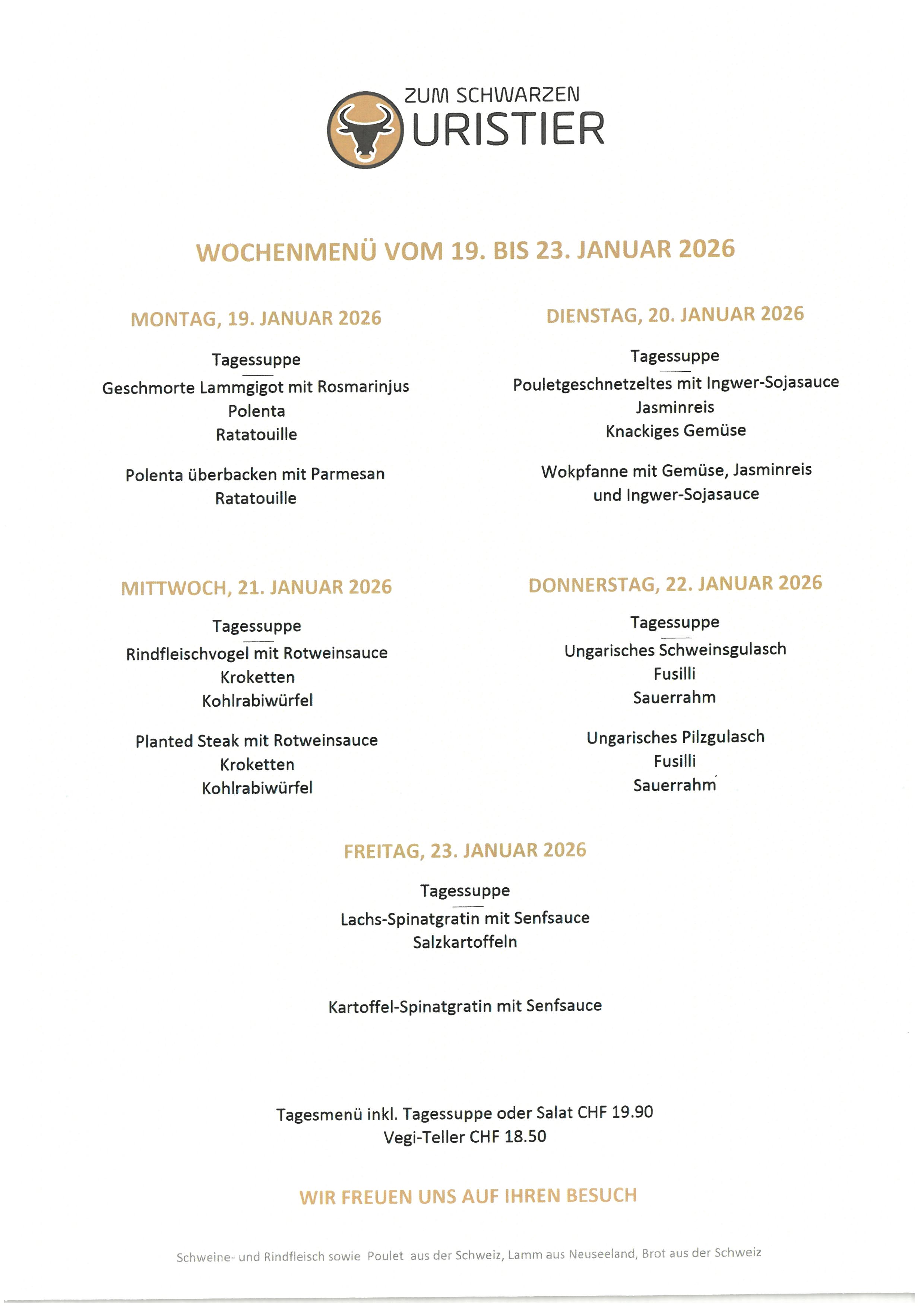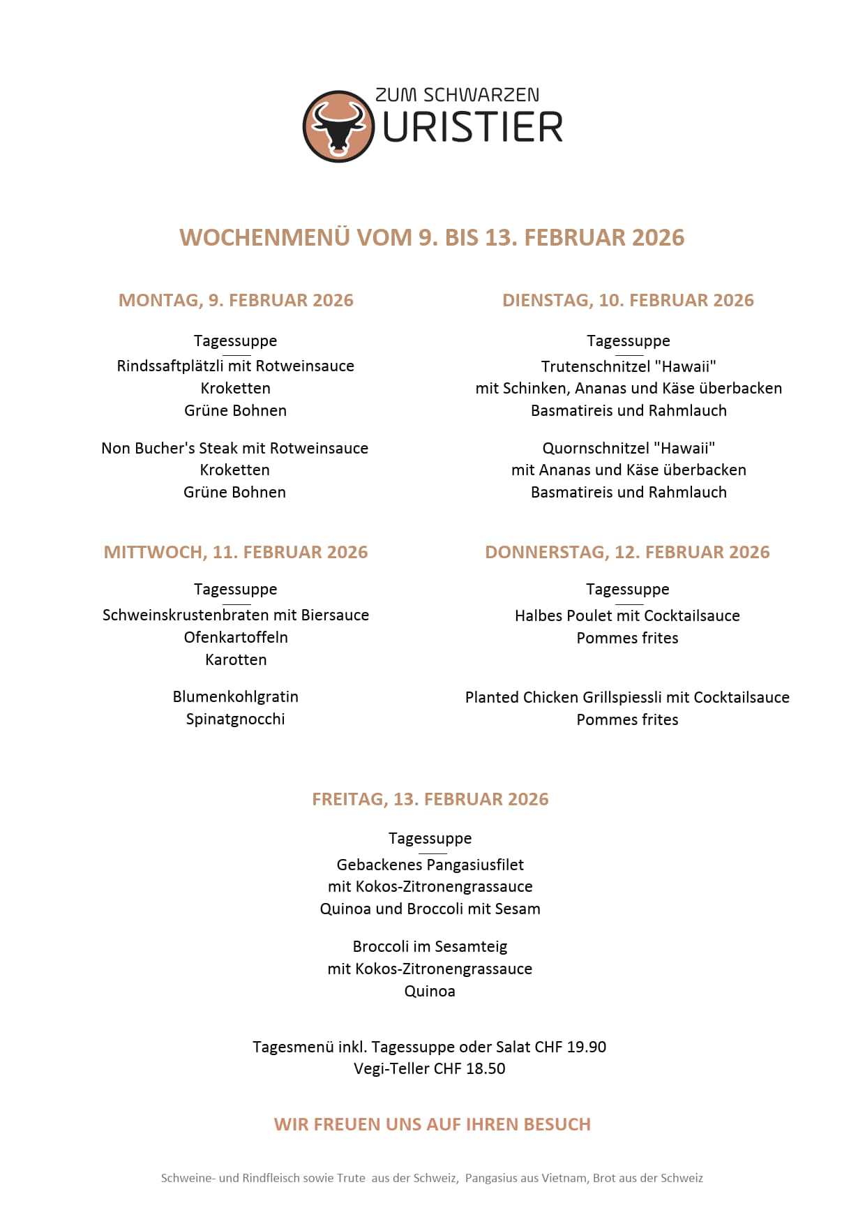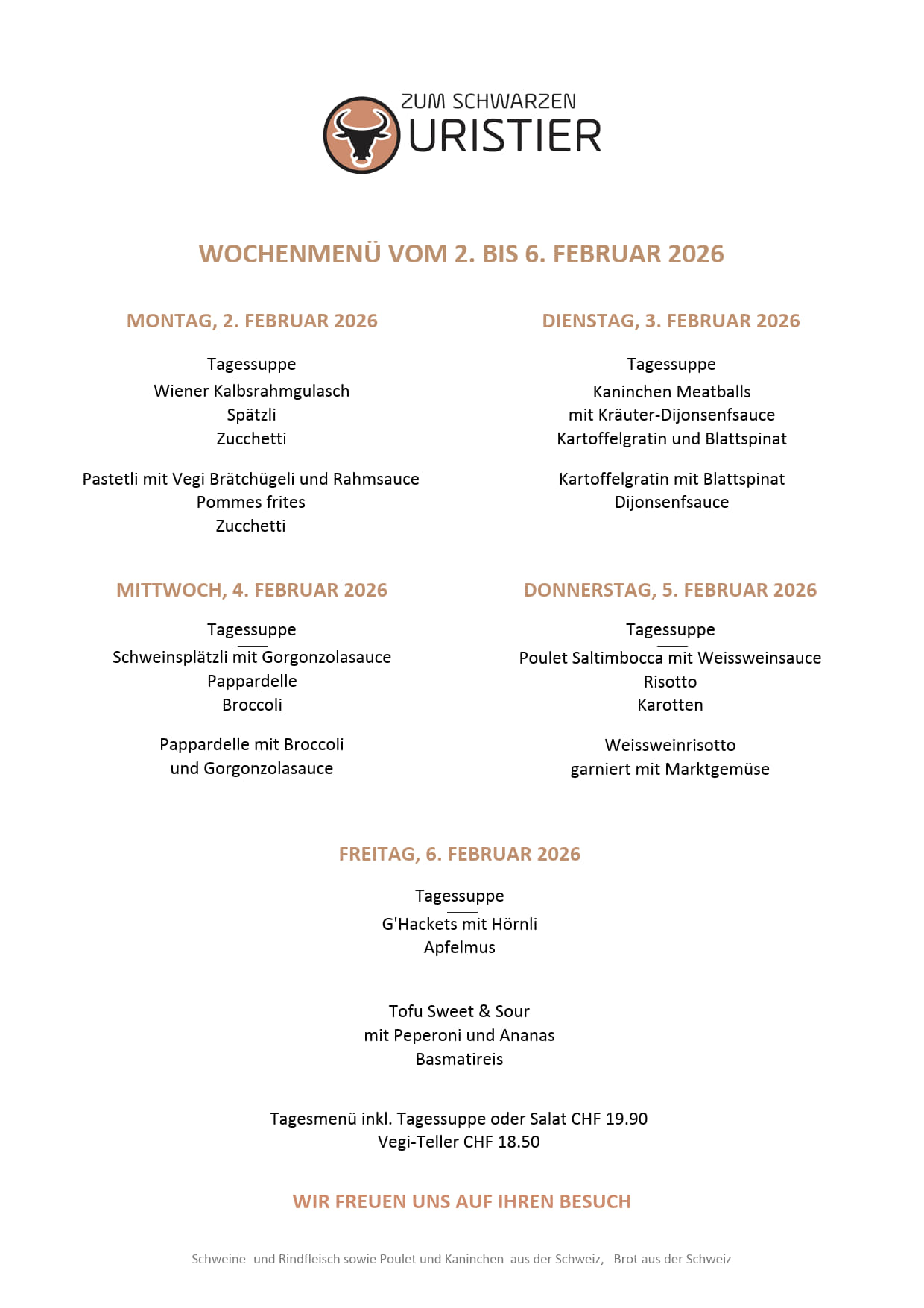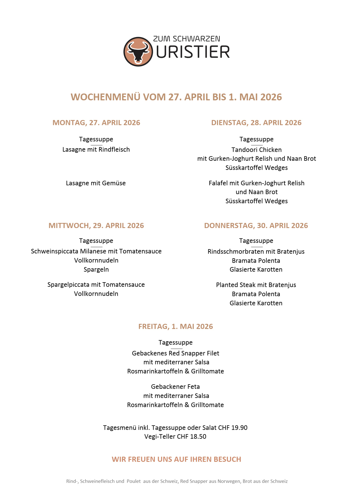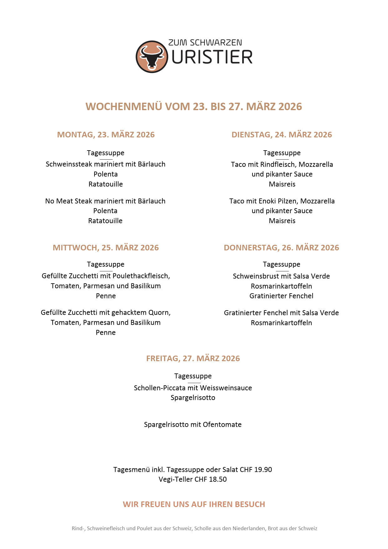 Im Tagesrestaurant «Zum schwarzen Uristier» verwöhnen wir Sie von Montag bis Freitag von 11 bis 15 Uhr. Entdecken Sie unsere frisch zubereiteten, saisonalen Angebote und unseren freundlichen, effizienten Service.